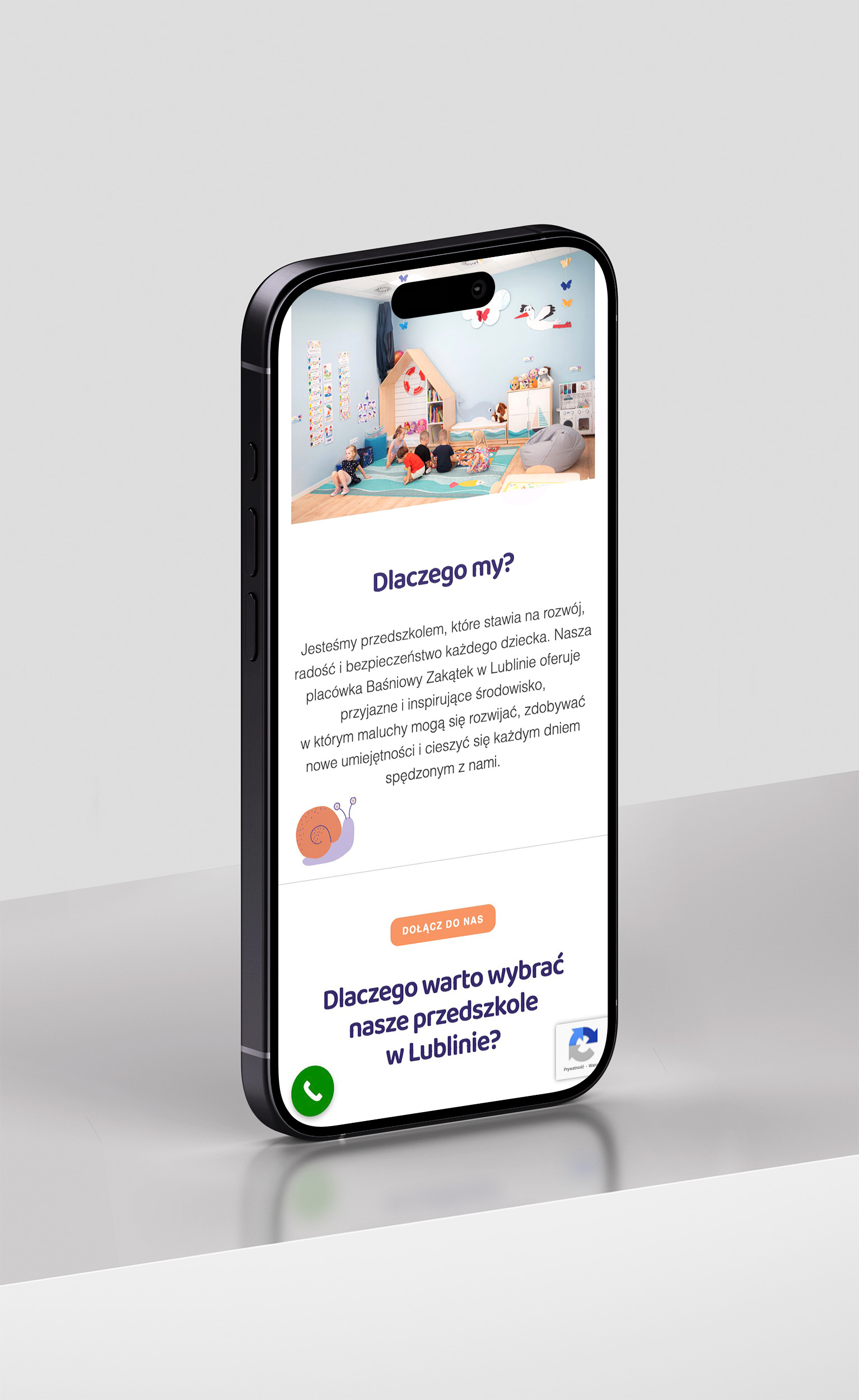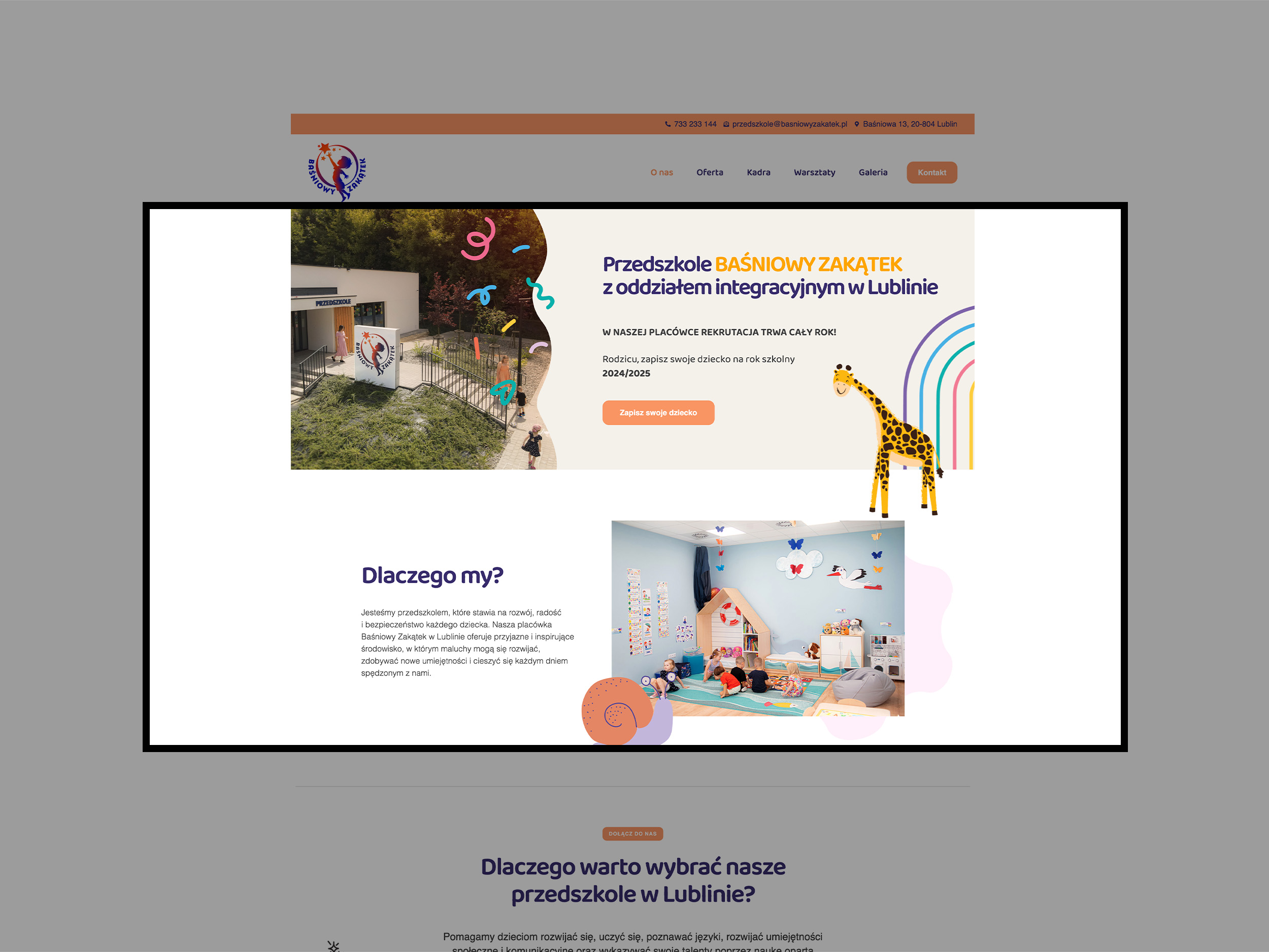 Storytelling i wizualna tożsamość: pastelowe kolory, delikatna typografia i zdjęcia z życia placówki budują emocjonalną więź z użytkownikiem. Teksty i zdjęcia na stronie oddają atmosferę „Baśniowego Zakątka” — miejsca przyjaznego, bezpiecznego i kreatywnego.