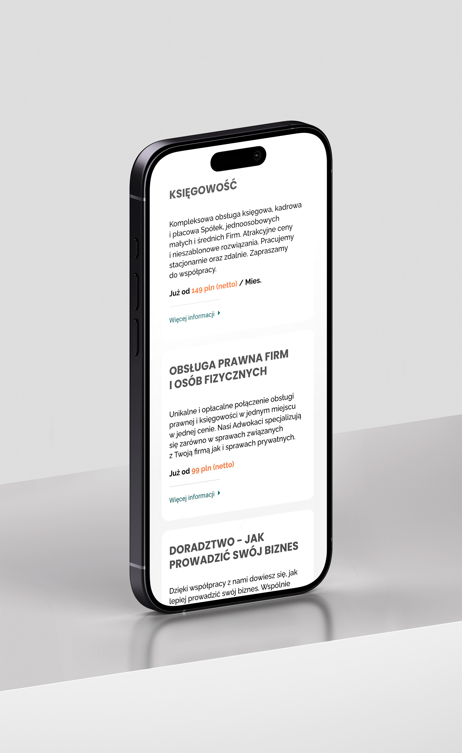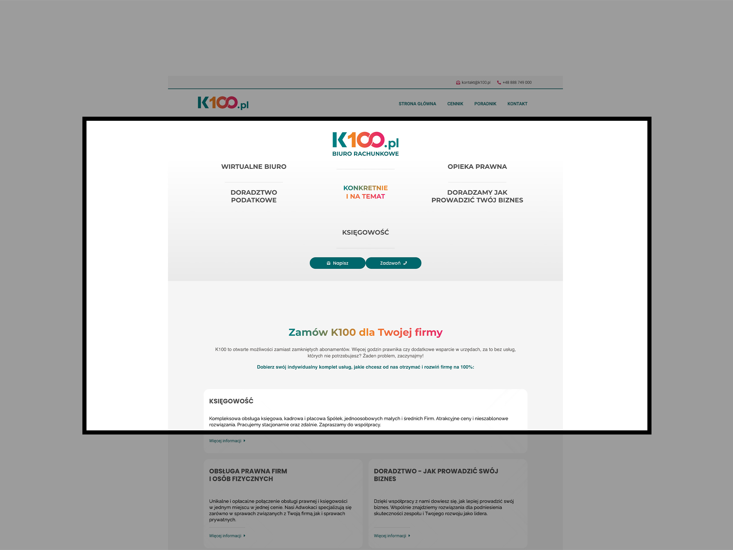 Strona przedstawia ofertę księgowości i doradztwa prawnego dla firm, umożliwiając klientowi zapoznanie się z dostępnym cennikiem usług oraz kontakt za pomocą formularza lub bezpośrednich danych teleadresowych. Oferuje dodatkowo dostęp do bogatego działu poradnikowego z artykułami dotyczącymi odpowiedzialności, podatków i prawa przedsiębiorców, co wzmacnia pozycję ekspercką firmy.